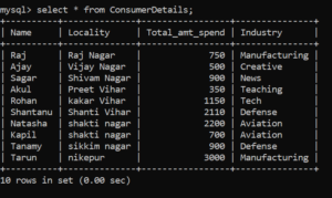 رائع ، لدينا 3 عملاء! لقد استخدمنا بند WHERE لتصفية البيانات بناءً على شرط أن يعيش المستهلكون في المنطقة المحلية – Shakti Nagar و Shanti Vihar.